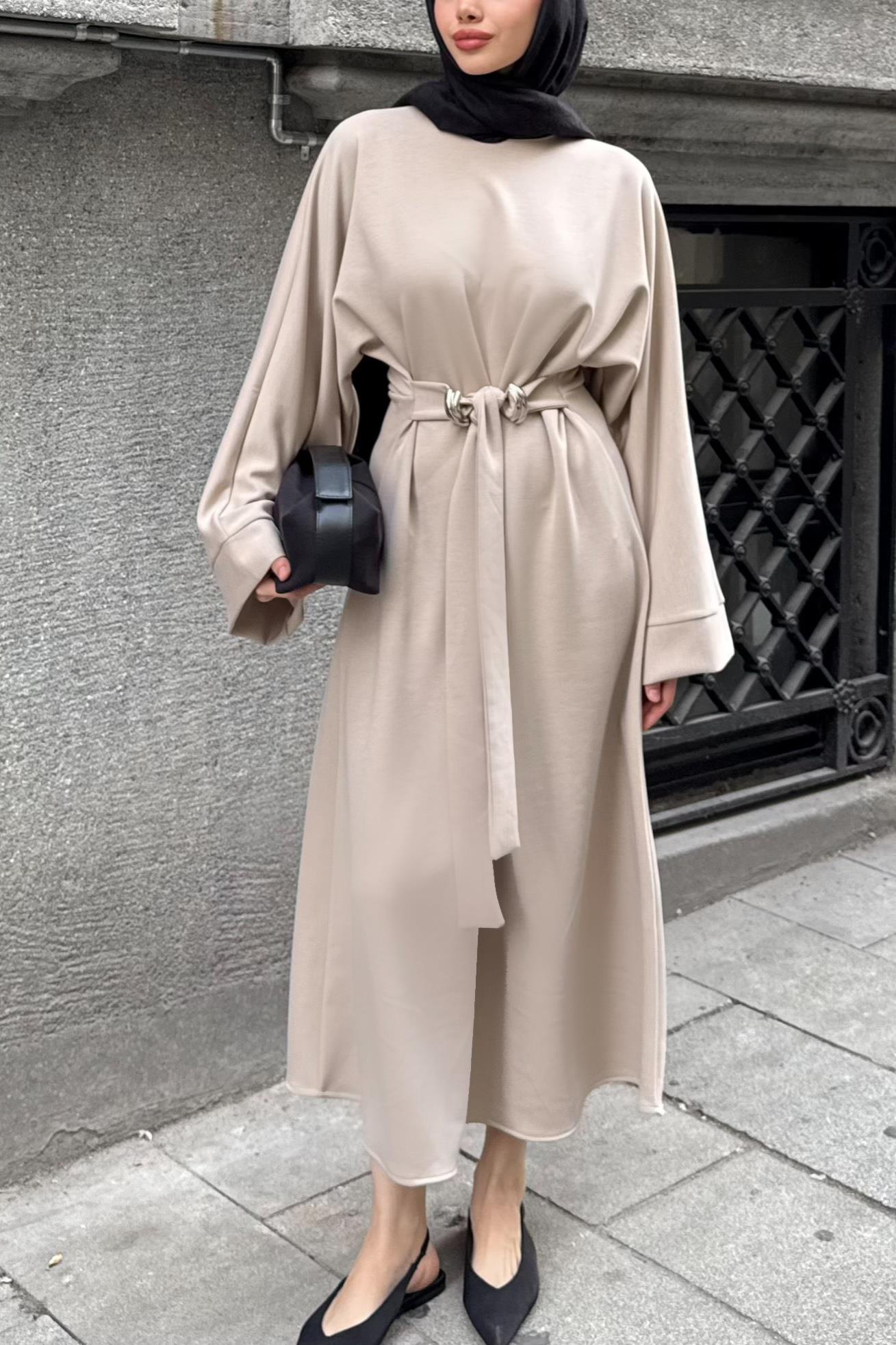 Aksesuarlı Belden Bağlamalı Elbise - Taş (K-1869)