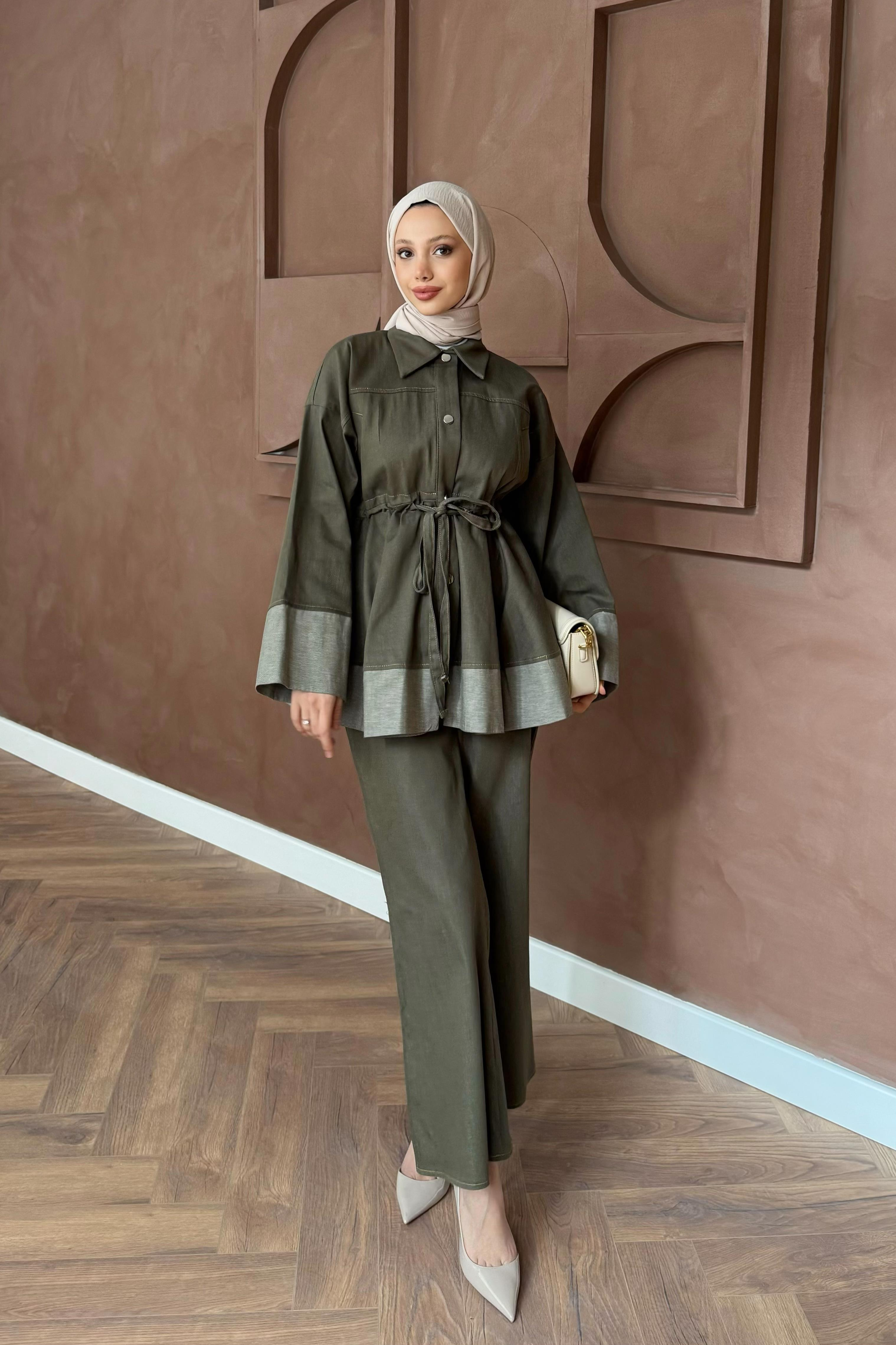 Belden Bağlamalı Pantolonlu Takım - Haki (6977)
