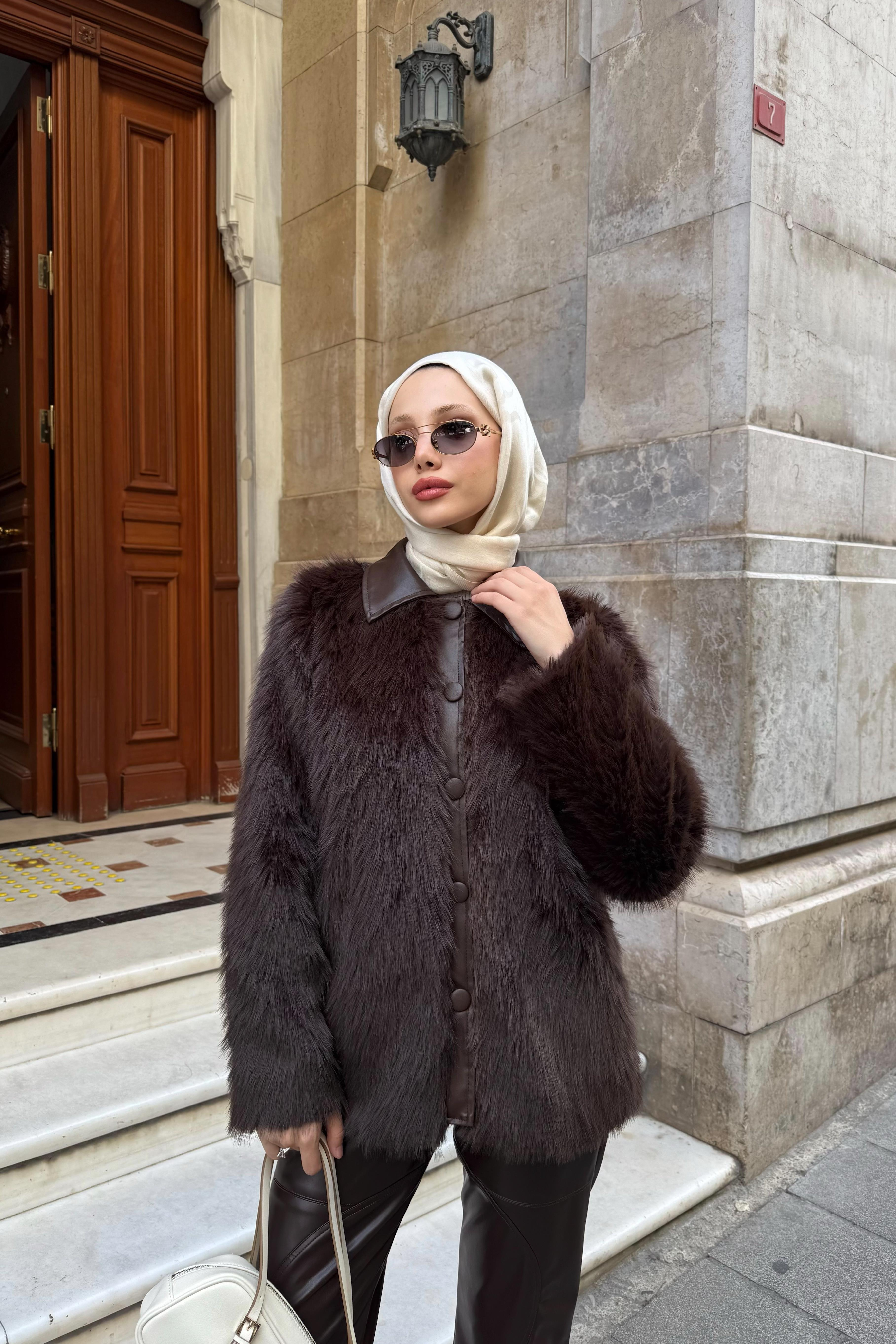 Deri Yakalı Kürk Mont - Kahve (51234)