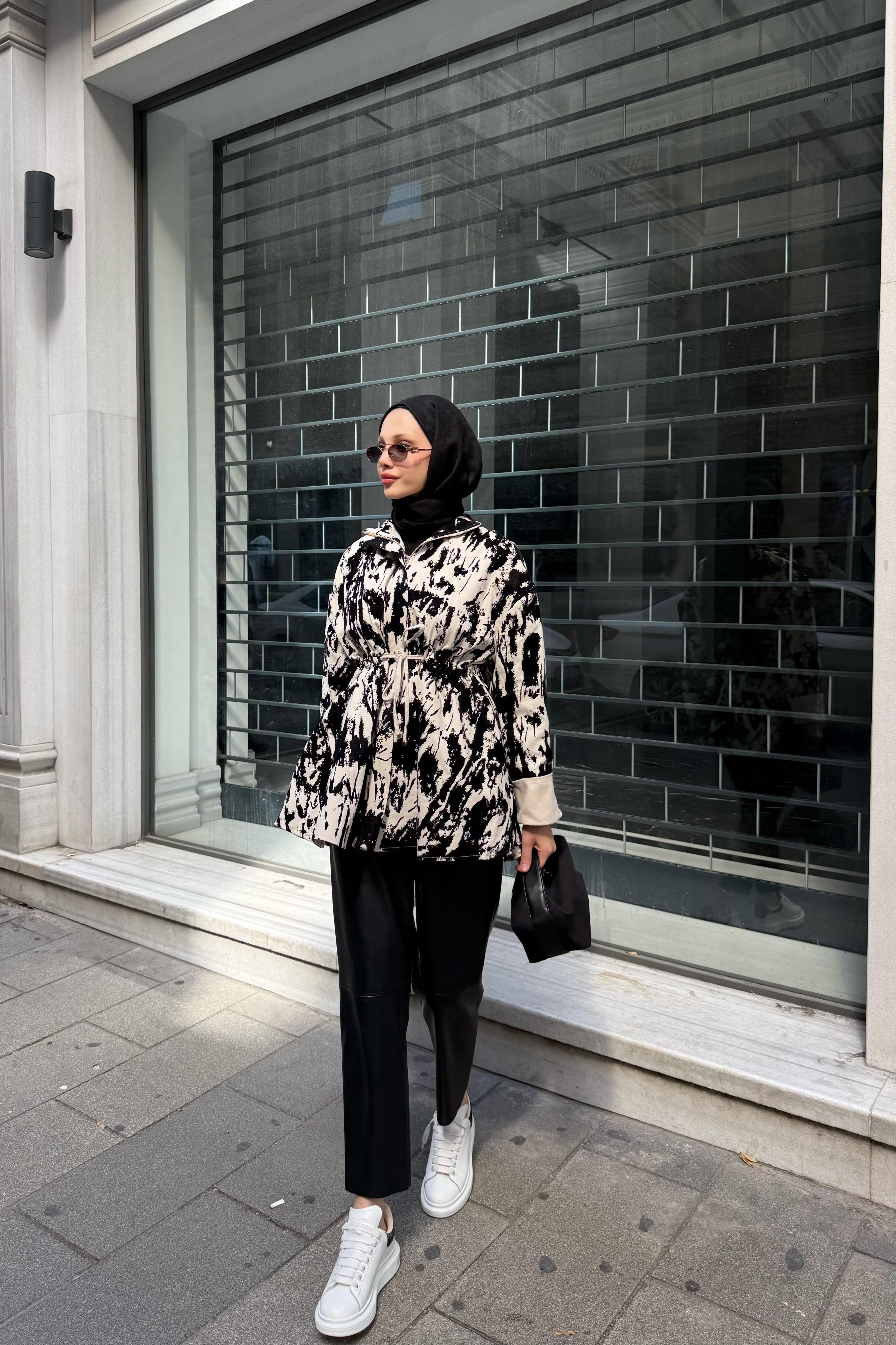 Desenli Bel Büzgülü Ceket - Siyah (A-8011)