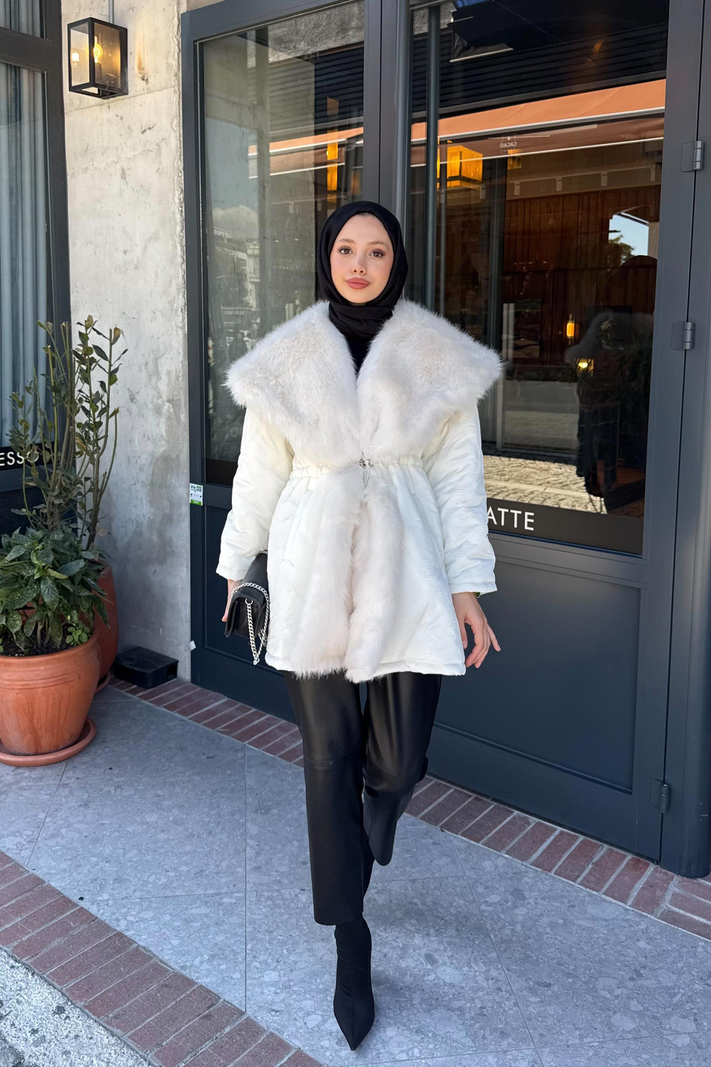 Kürk yaka , beli ayarlanabilir lastikli , kullanılabilir çift cepli , içi astarlıdır .