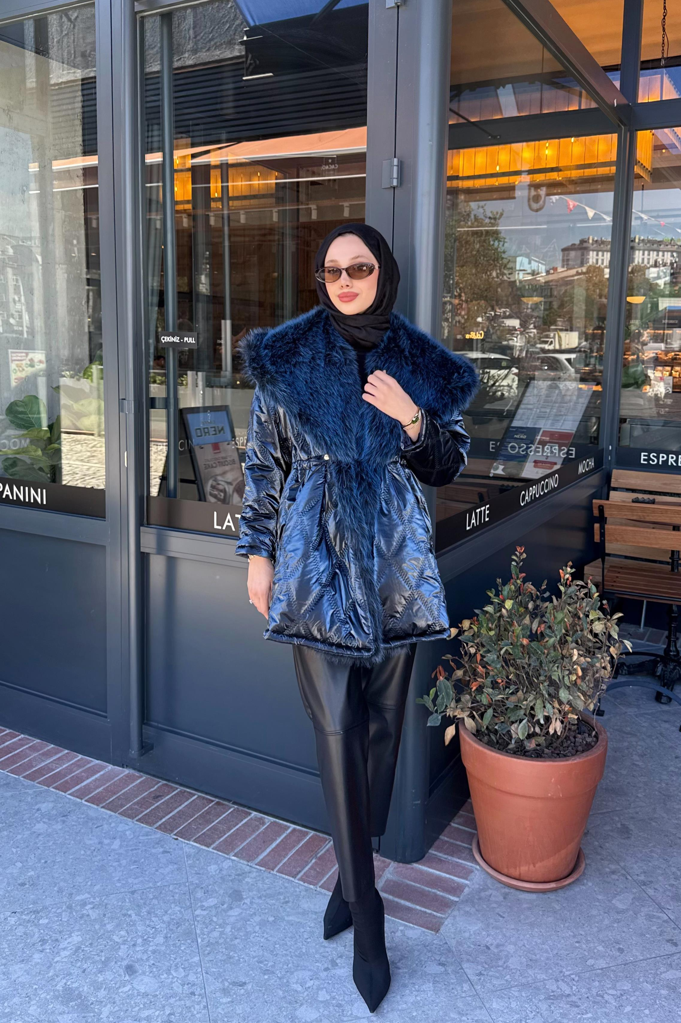 Beli Lastikli Kapitone Mont - Lacivert (K-6171)