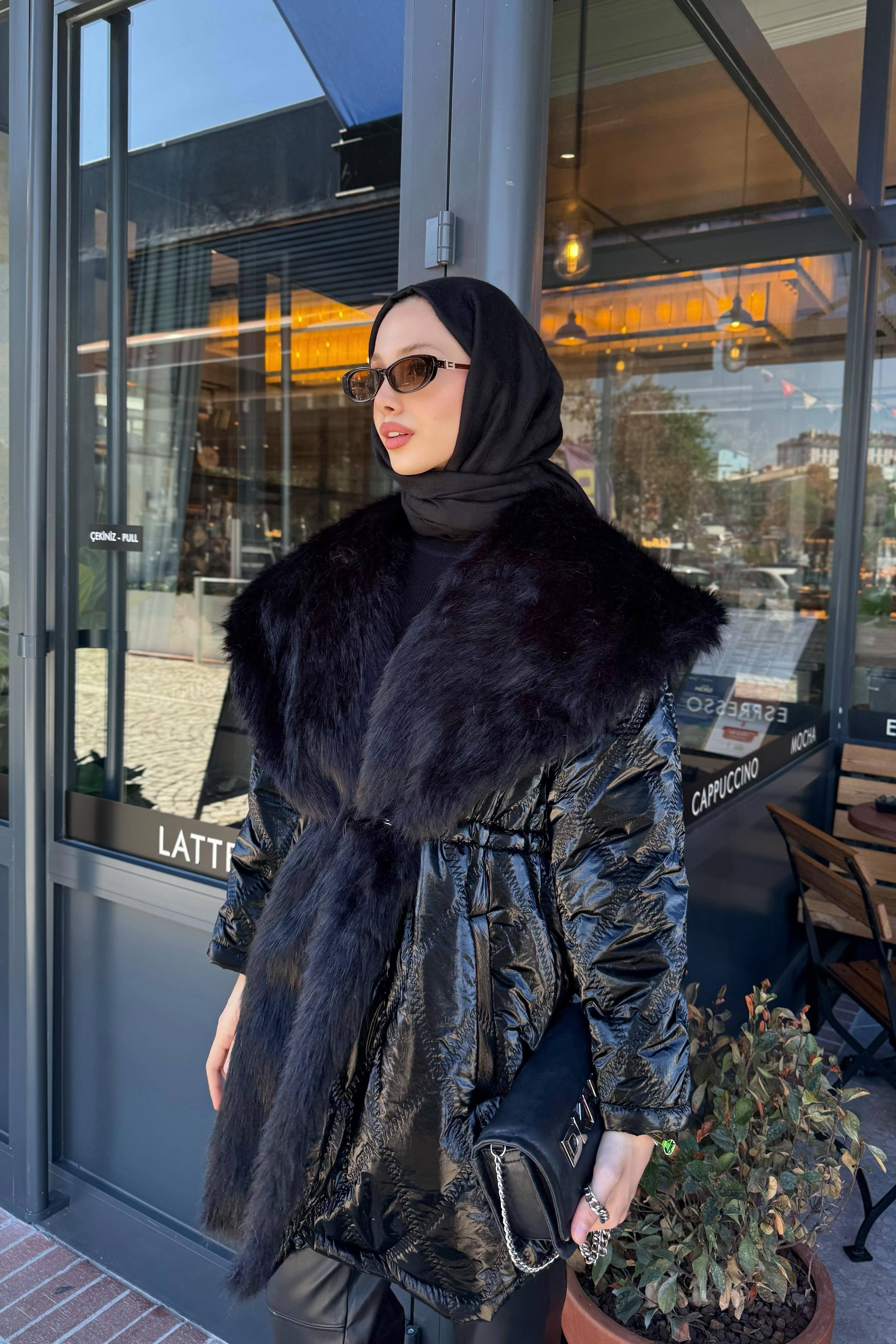 Kürk yaka , beli ayarlanabilir lastikli , kullanılabilir çift cepli , içi astarlıdır .