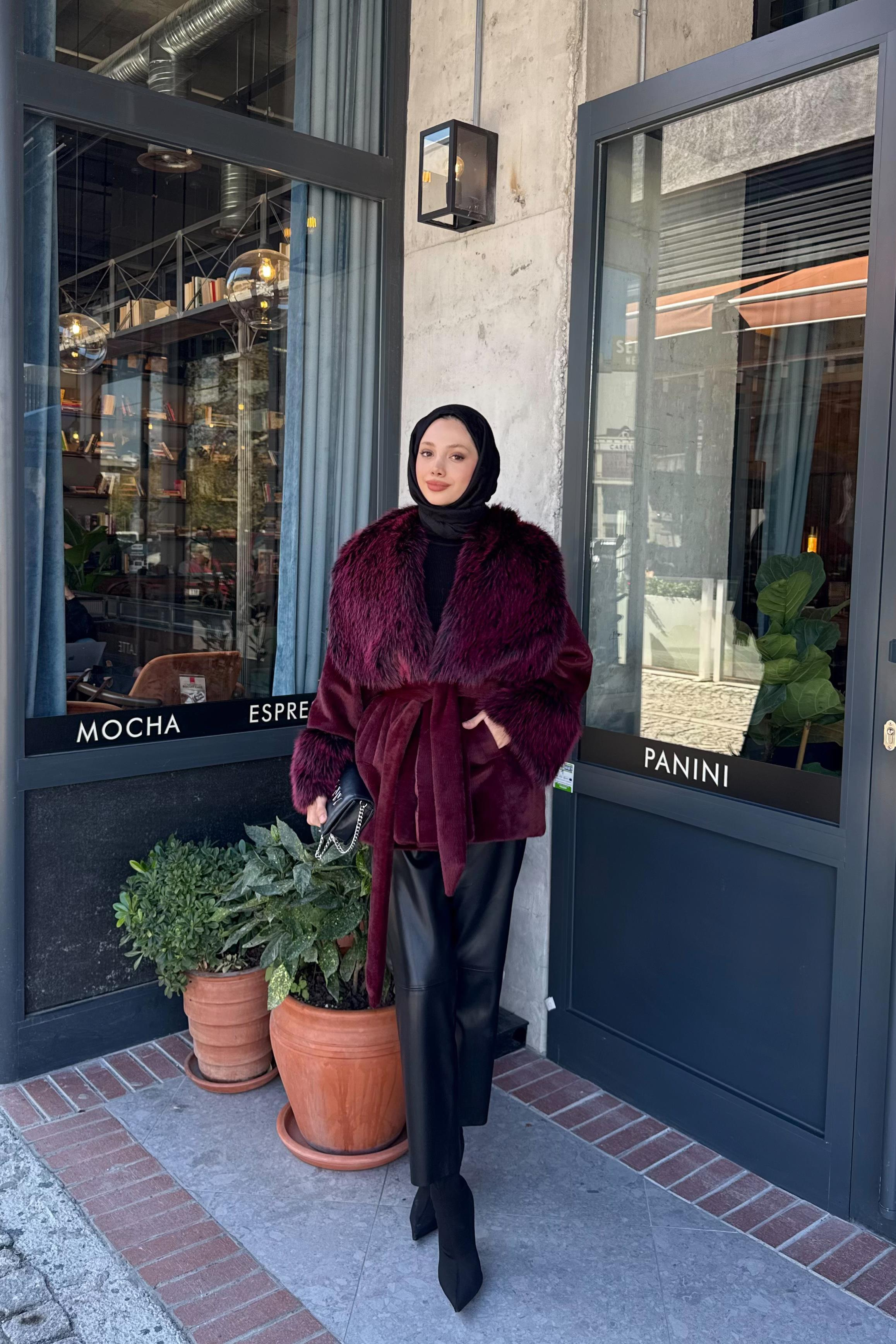Kürk Yakalı Goldfox Kaban - Bordo (K-6172)