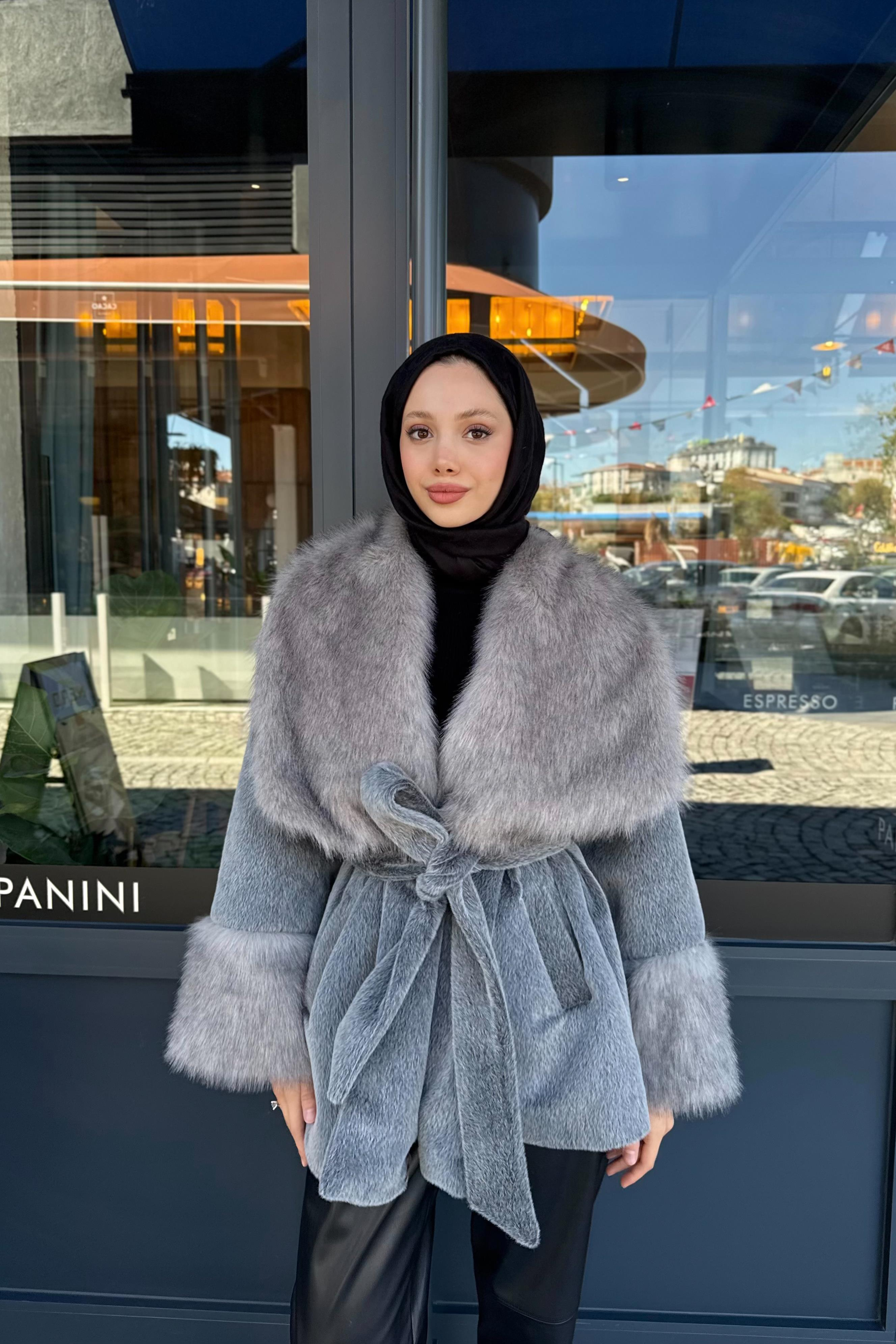 Kol ve yakası kürk detaylı , kullanılabilir çift cepli , içi astarlı , seyyar kuşaklıdır