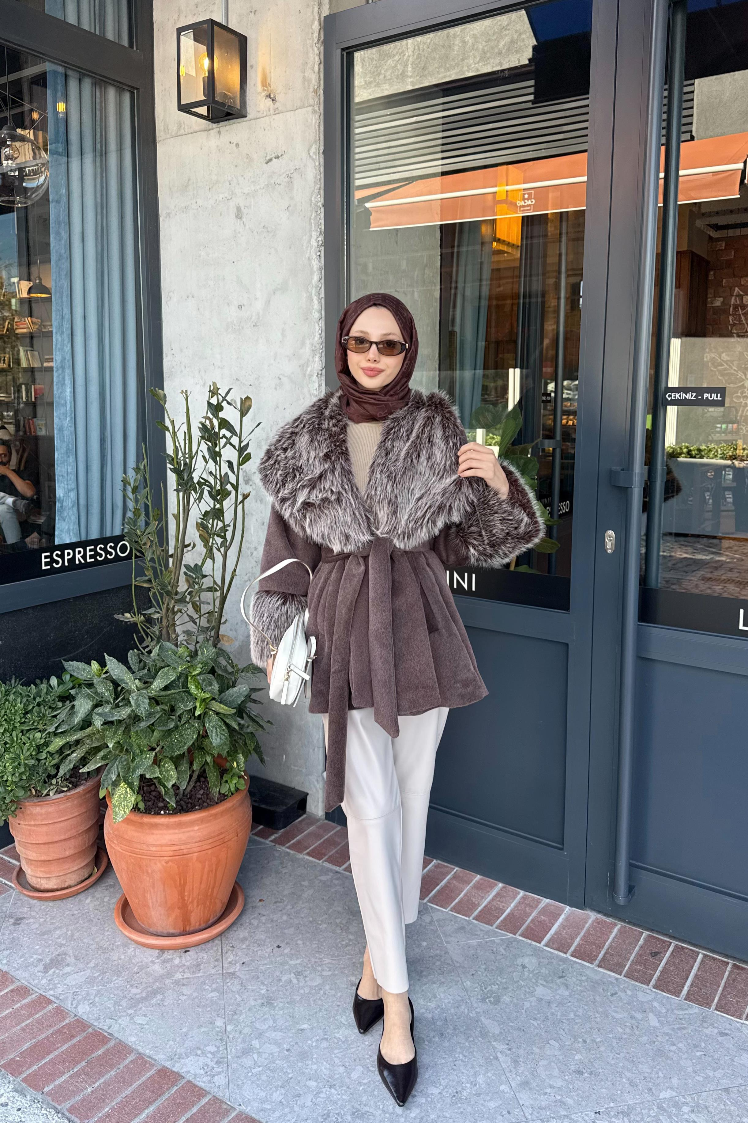 Kürk Yakalı Goldfox Kaban - Kahve (K-6172)