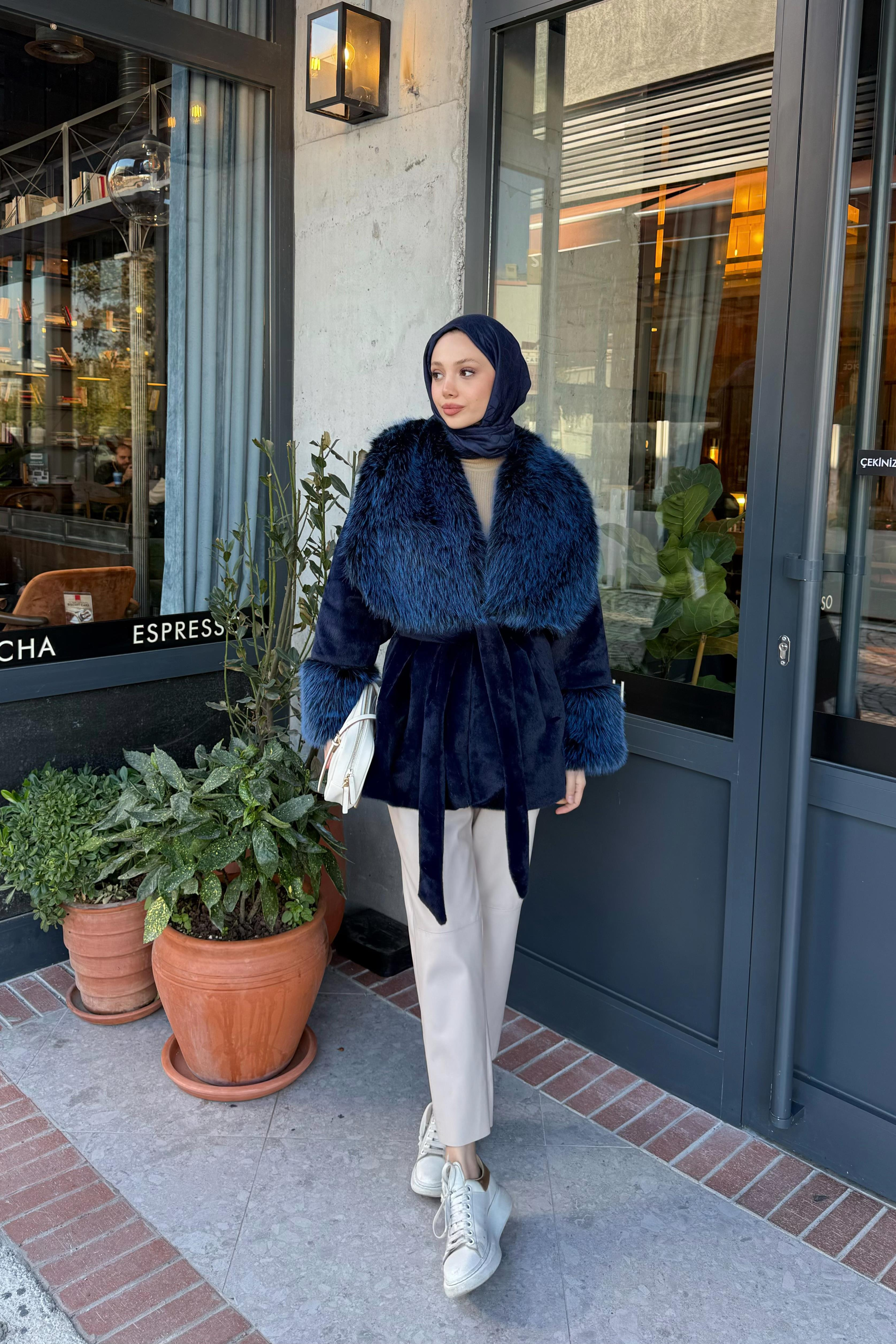 Kürk Yakalı Goldfox Kaban - Lacivert (K-6172)