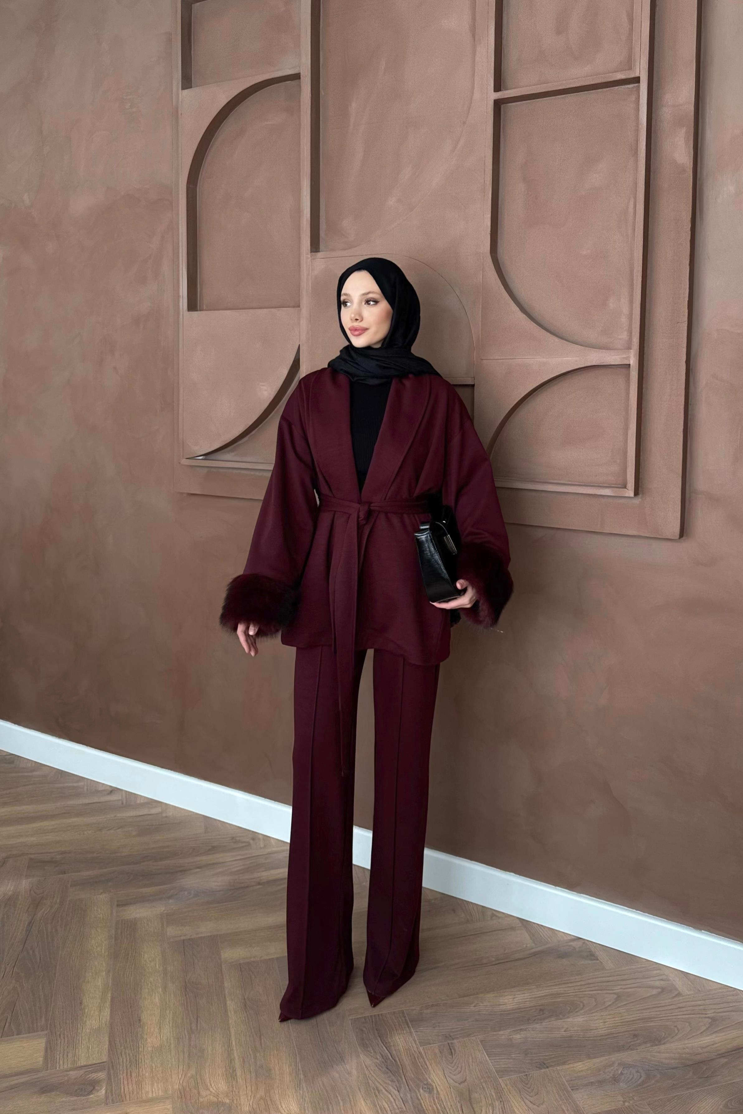 Kürk Kol Detaylı Pantolonlu Takım - Mürdüm (K-2353)