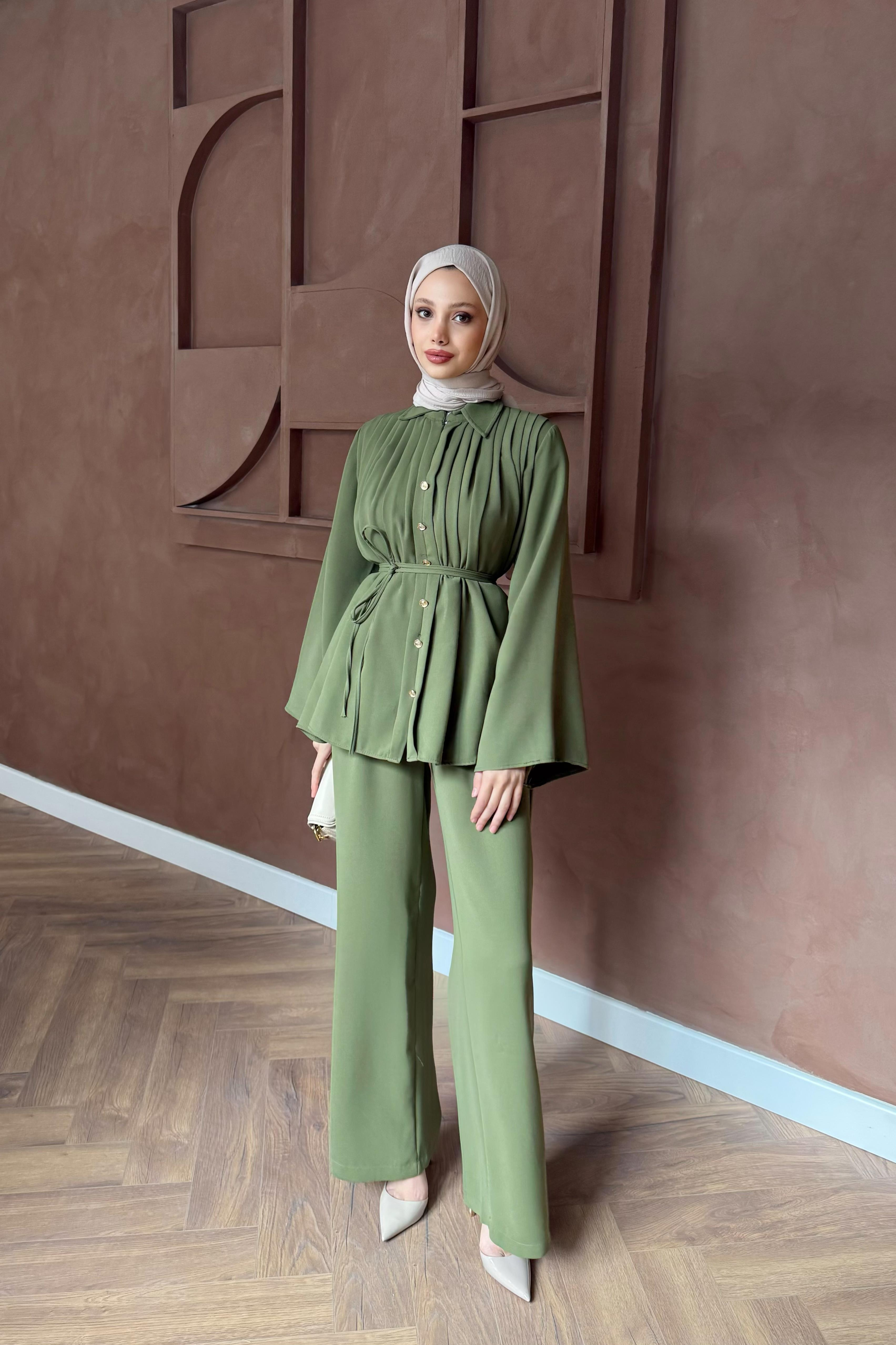 Pantolon : Beli lastikli, düz bol kesime sahiptir.